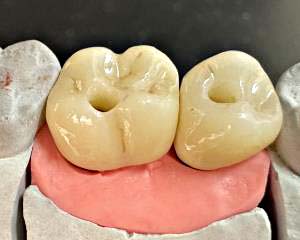 Zur Herstellung monolithischer, vollanatomischer Kronen und Brücken stehen transluzente oder auch chromatisch unterschiedlich aufgebaute Sinter-Zirkon-Materialien zur Verfügung, die einerseits vor dem Sintervorgang eingefärbt wie andererseits nach der Endbearbeitung bemalt und glasiert werden können. Eine Verblendung ist nicht mehr notwendig.